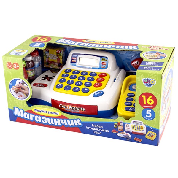 Касовий апарат на батарейці, звук, світло, калькулятор, продукти, в коробці 43х18х18см 7020-UA (12)