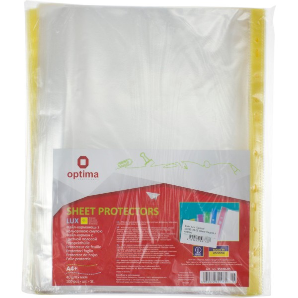 Файл А4+ Optima, 40 мкм гладкий, з жовтою стрічкою 100 шт в пачці (20 пачок/ящик) O35108-05 Файл А4+ Optima, 40 мкм гладкий, з жовтою стрічкою 100 шт в пачці (20 пачок/ящик) O35108-05 Файл А4+ Optima, 40 мкм гладкий, з жовтою стрічкою 100 шт в пачці (20 пачок/ящик) O35108-05