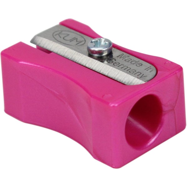 Пластикова точилка KUM має прямокутний корпус зі зручними виїмками для пальців. Надгострі вигнуті леза з легкістю заточують будь-які олівці, навіть олівці поганої якості. Корпус з первинного пластику дуже міцний, виконаний максимально точно. Леза захищені від іржі. Асорті кольорів металік: фіолетовий, рожевий, зелений.