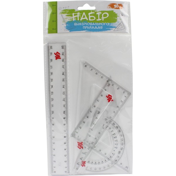 Креслярський набір з прозорого пластику містить в собі чотири предмети: лінійка 20 см, транспортир 180° , трикутник рівнобедрений 10х10 см, трикутник прямокутний 14х8 см. Призначений для створення креслень, а також для точного вимірювання лінійних розмірів та інших геометричних параметрів.